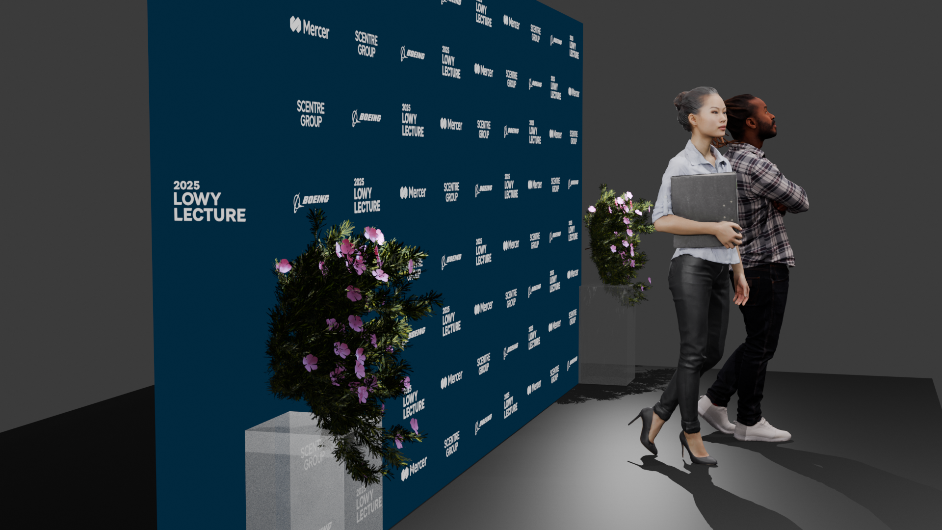 This unified design extended the tone of the video into the physical and digital space, connecting every visual element into one aesthetic language. The result: a consistent and elevated identity that framed the Lowy Lecture logo, camera layout, and broadcast designwith clarity and impact.